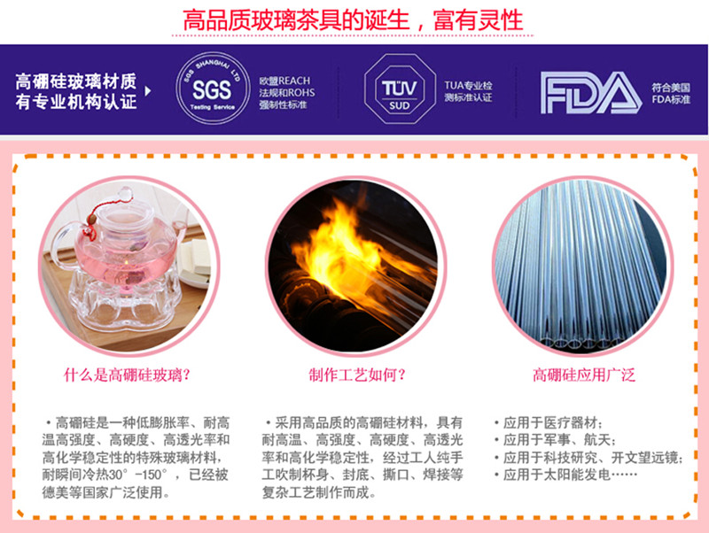 【產(chǎn)品材質(zhì)】:高硼硅耐熱玻璃 冰至零下 倒入開水 完好無損